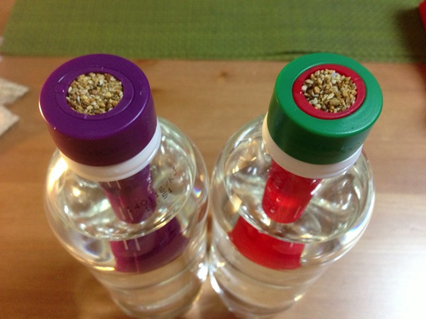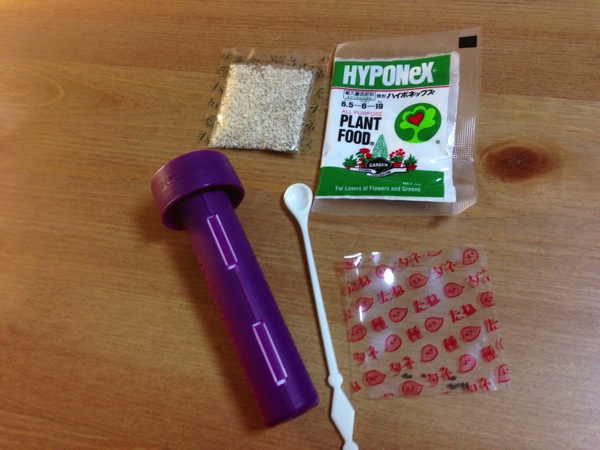 ペットボトルに水を張り、ホルダーをセット。タネを2~3粒置いて、付属の砂をすりきりで被せる。で、水を数滴上から垂らして完成!10日ほどで発芽するらしいです。