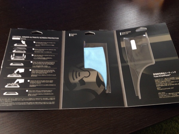パッケージは高級感ある感じで開くと、メンテナンス用クロスとホームボタンシール、ガラスフィルムが入っています。