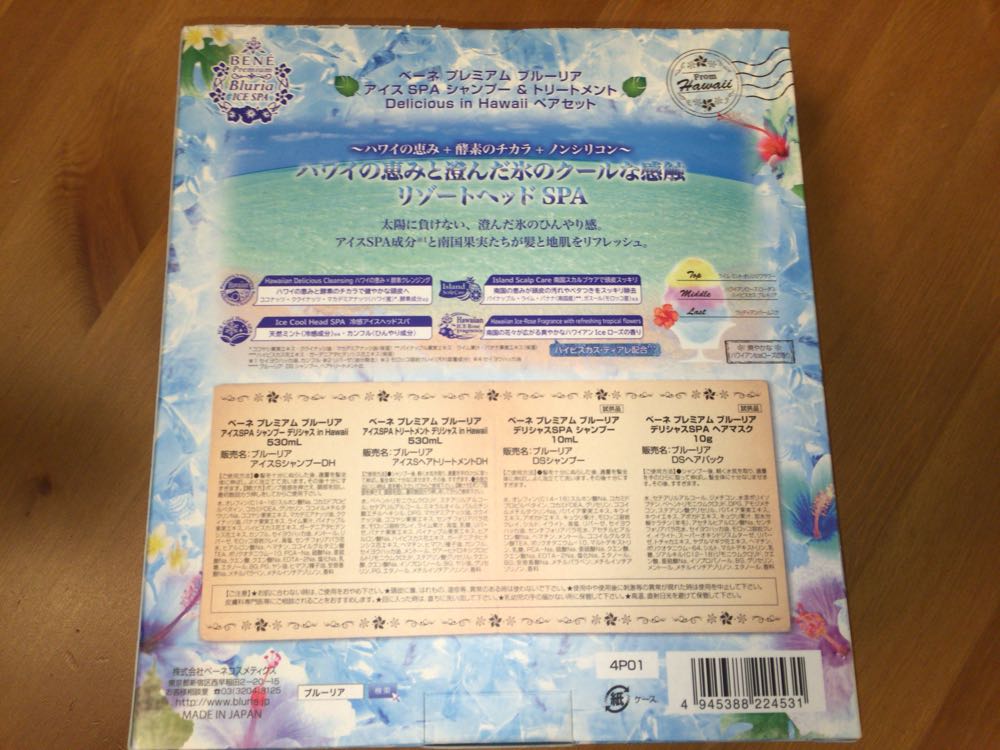 アイスSPAとある通り、クールな感触のようで夏向きな感じです。リゾートスパなんて良いですね。成分はハワイの恵み、ココナッツやパイナップルなどたくさんのエキスが配合されているようです。