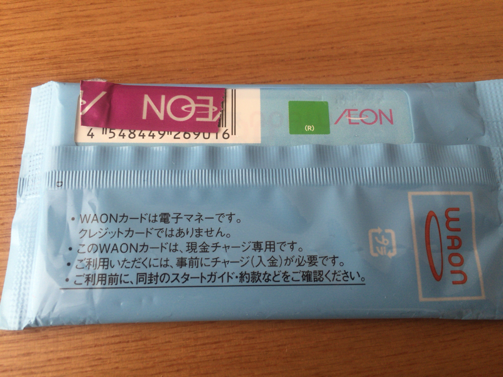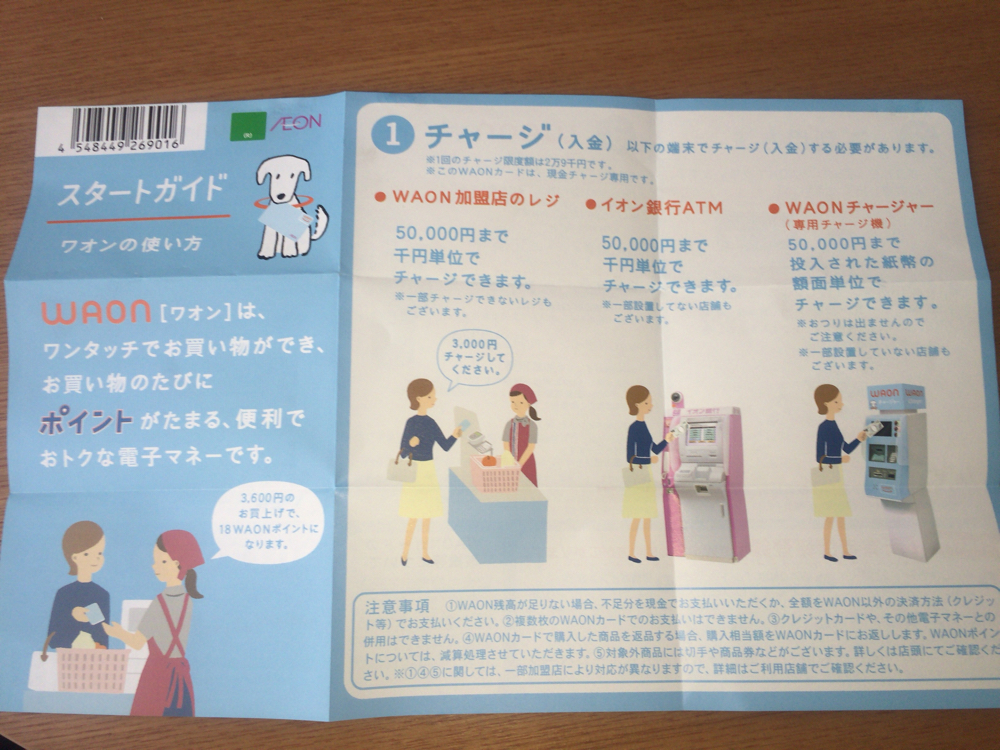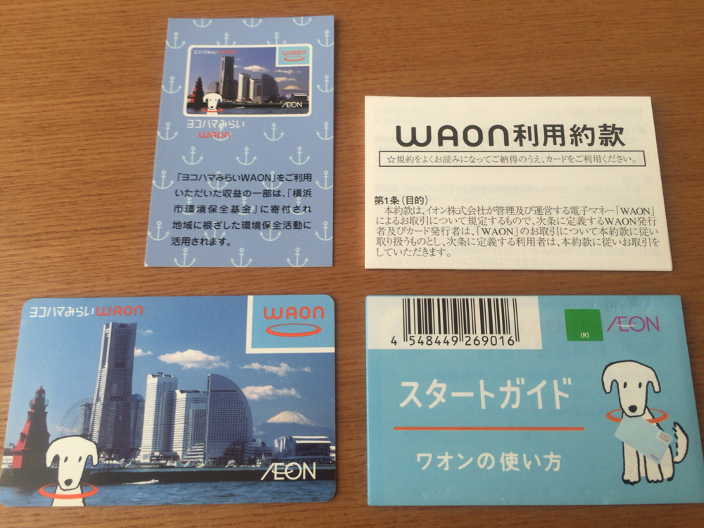 左上から表紙的な紙、WAONカード、利用約款、スタートガイドです。