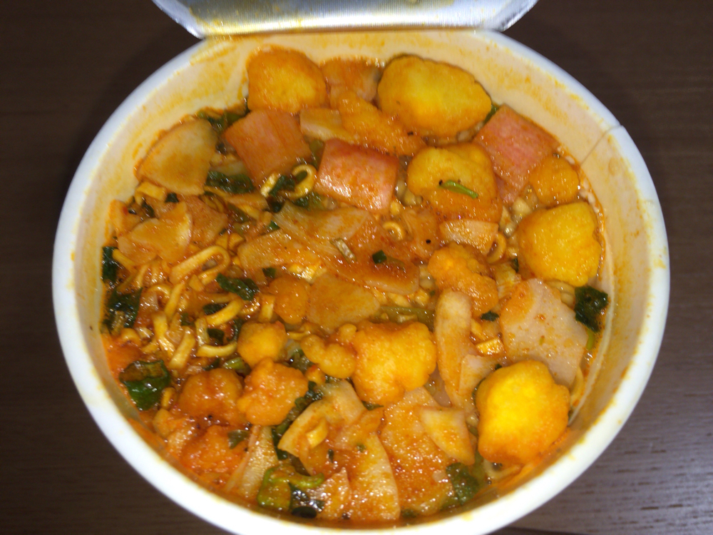 お湯入れて3分。出来ました。赤いです!辛そうですね。どは、頂きます。元がシーフード味なので味に間違いは無いですが、辛さがマッチして夏にはもってこいです。辛さがシーフード味でマイルドになり食べやすい辛さになっています。