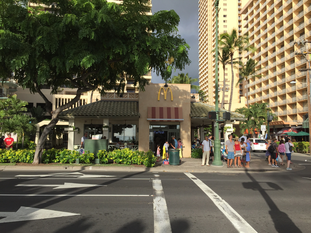 パシフィックビーチホテル横の交差点角にあるマクドナルドですが、滞在中は何度か利用することがある店舗。昔はマクドナルドの赤がメインの外装でした。