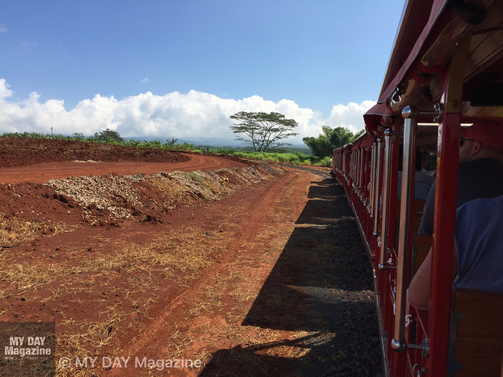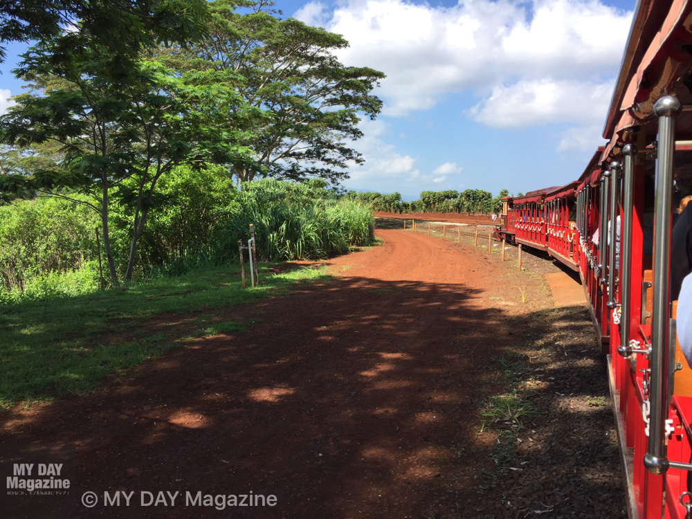 赤い機関車に乗って広大なプランテーションを走ります。