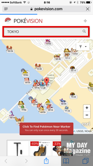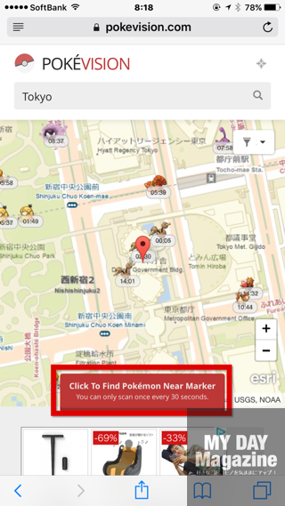 こちらは非常にお手軽です。アプリ開き位置サービスを許可するとすぐに現在地周りなります。ポケビジョンのように地名を指定できないので、遠くの場所であれば自分で地図をスクロールしてください。