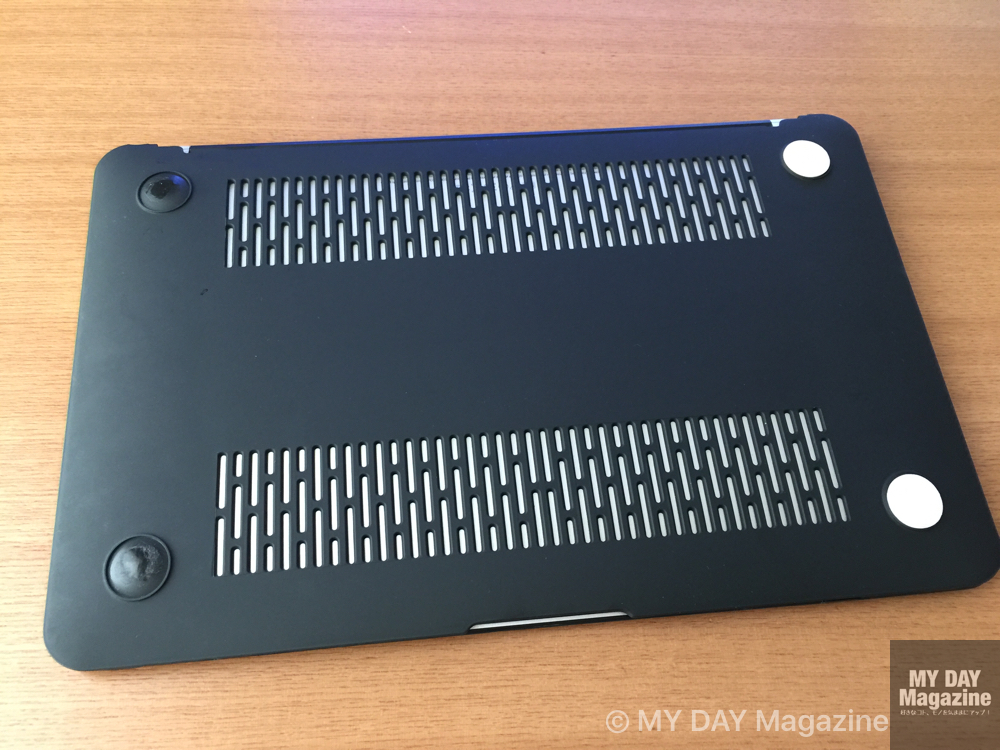 このハードケースタイプは、保護の観点から言えば安心感もあり価格も安く良いものだとは思います。しかし、プラスチックを装着する分、やや重くなります。また、せっかく薄いmacbookに厚みも出てしまい、野暮ったい感じに。