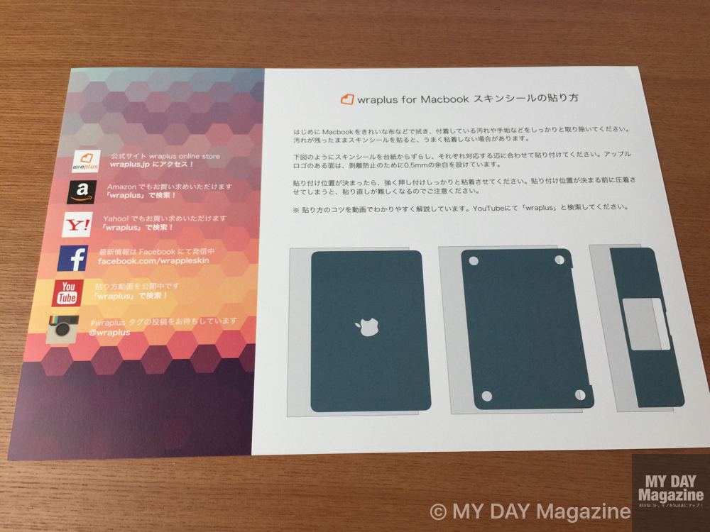 パッケージの用紙裏に簡単な貼り方が記載されています。詳しい貼り方はwraplusのYouTubeに動画掲載されています。