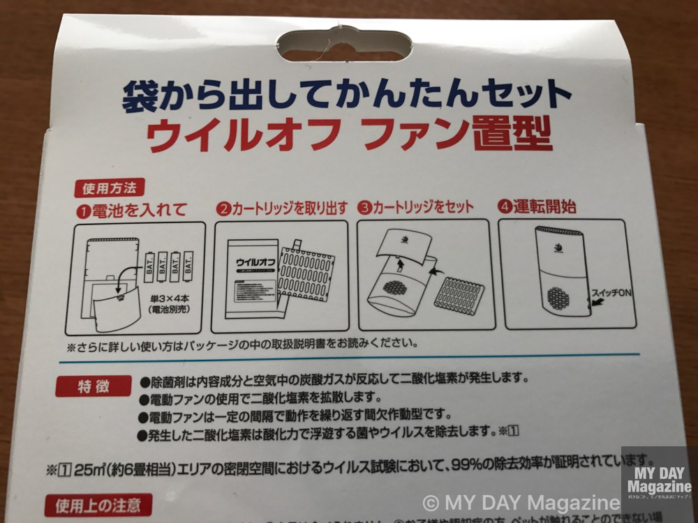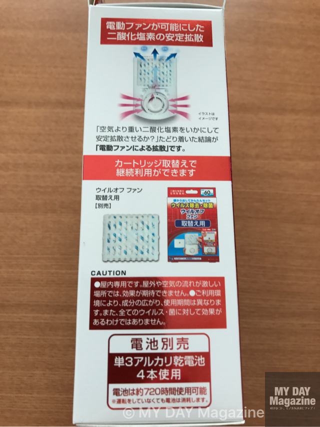 クレベリンは自然揮発タイプでしたが今回のウイルオフファンは電動ファン搭載で部屋に除菌剤を満遍なく対流させます。