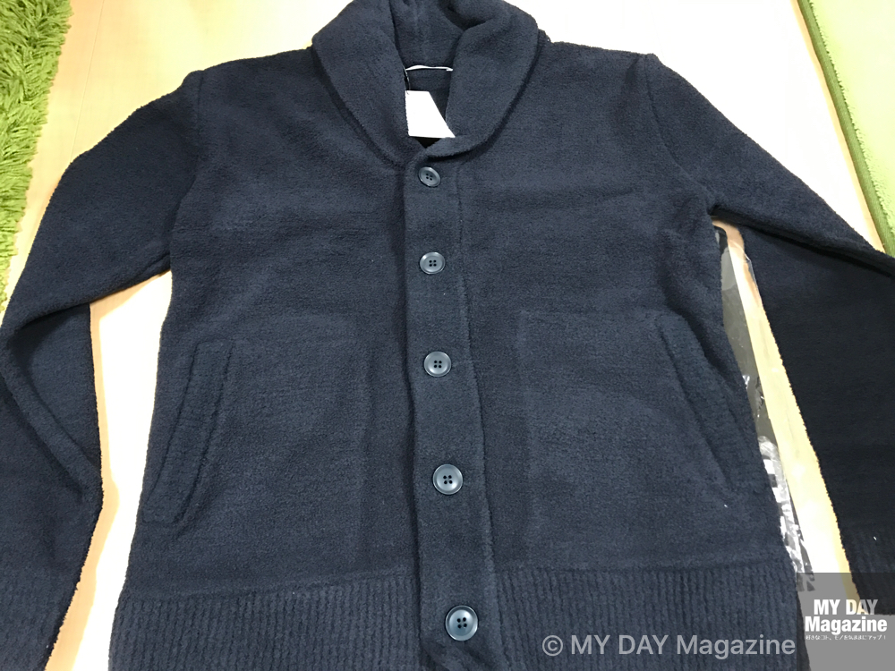 まずはアウター。厚手のカーディガンです。ネイビー。厚手のパイル生地で触り心地かなりいいです。