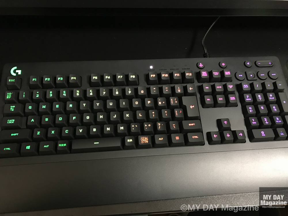 タッチ感はしっかりしています。パームレスト付きなのでキーボード自体は大きく感じますが、打ちやすいですね。ゲーム以外の用途にも十分対応できそうです。
