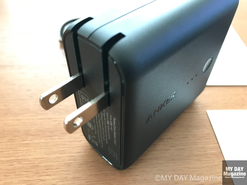 ANKERロゴの横にボタンがあり、バッテリーの残量を確認できます。本体はコンパクトですがやや厚みはありますね。重さは思っていたよりは軽い印象です。バッテリー自体への充電は、コンセントにさしても行えますので簡単です。ただデバイスを充電中に、バッテリーへの充電は同時にはできないようなので注意が必要です。