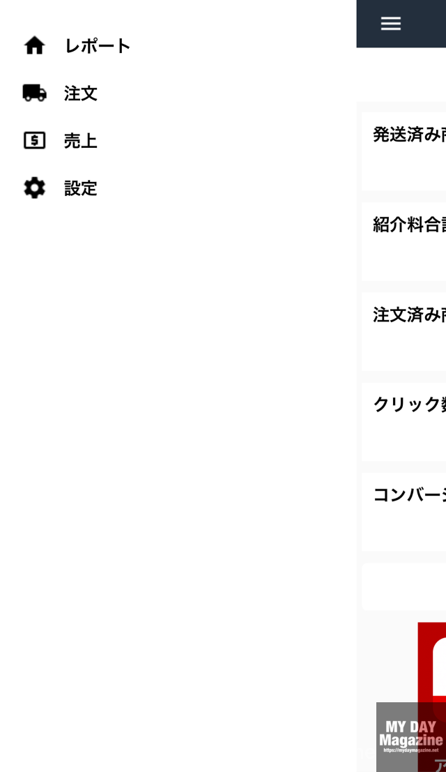レポートを開くと発送済み商品、紹介料、注文済み商品、クリック率、コンバージョン率が表示されます。