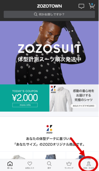 ZOZOTOWNアプリのホームから下にある計測・その他のタブから計測していきます。