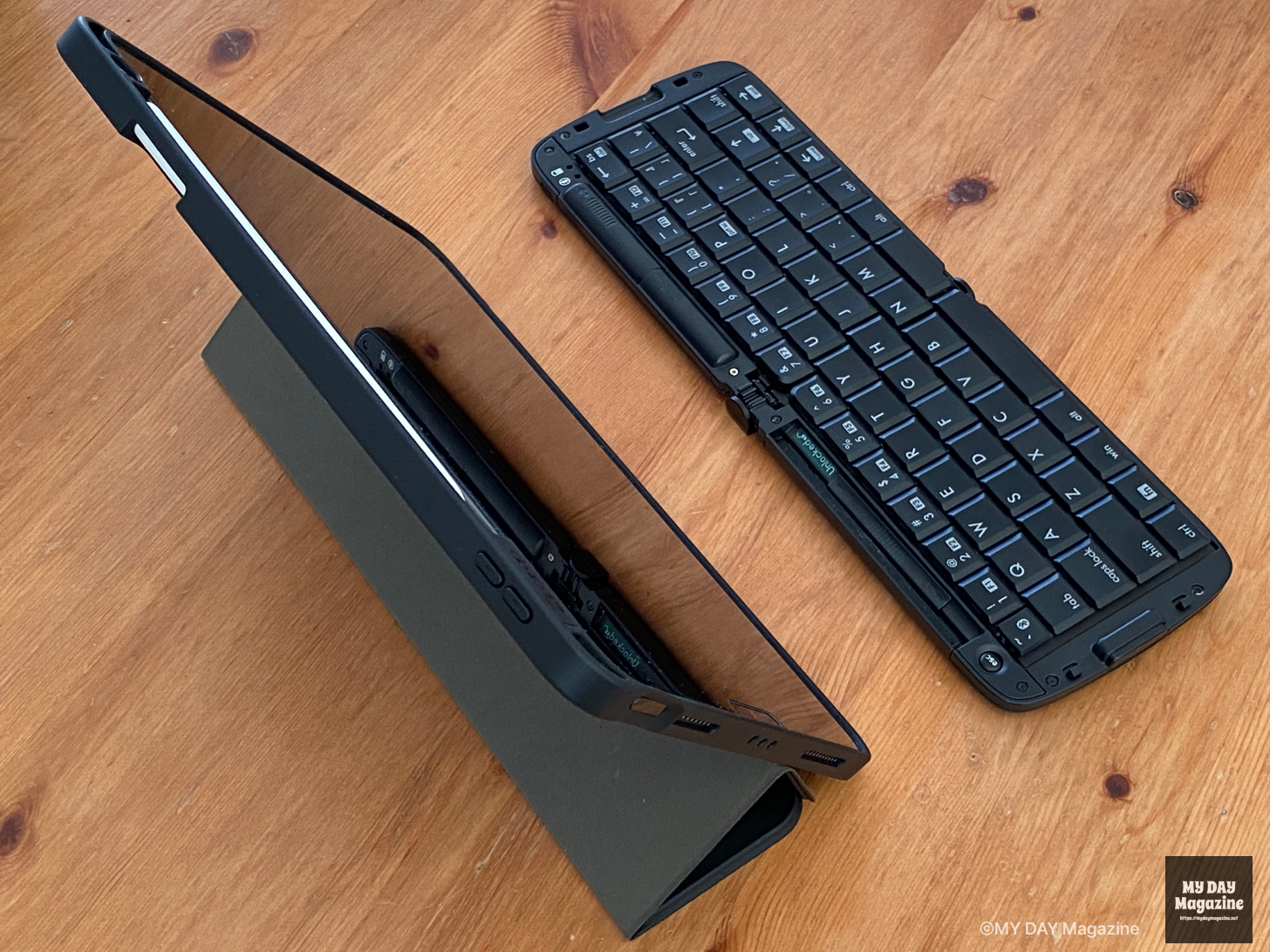 独立型のキーボードとのセットで使ってますが、このような感じで省スペースで使用ができること、キーボードが動かせるのでケース一体型より使い勝手はいいと思います。