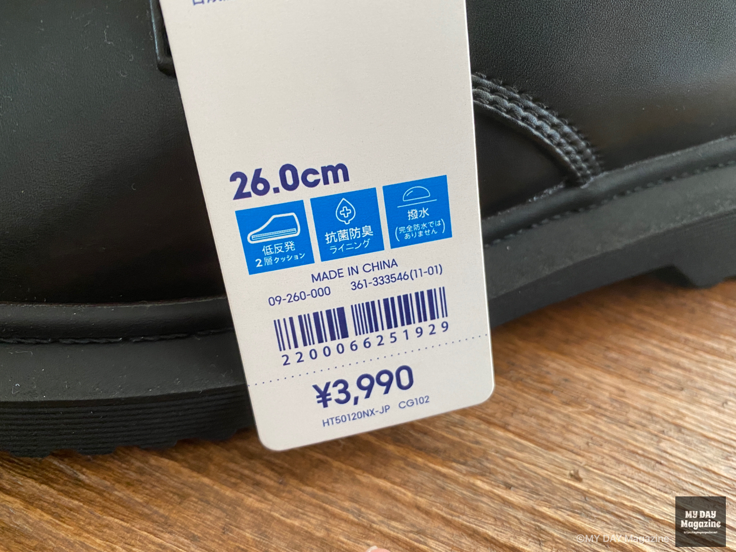 実際に店舗で商品を確認した所、合皮の素材感はやや艶のある感じで、若干安っぽいのも否めませんが、履いていくうちによれ出てくるので初めだけかなと感じました。