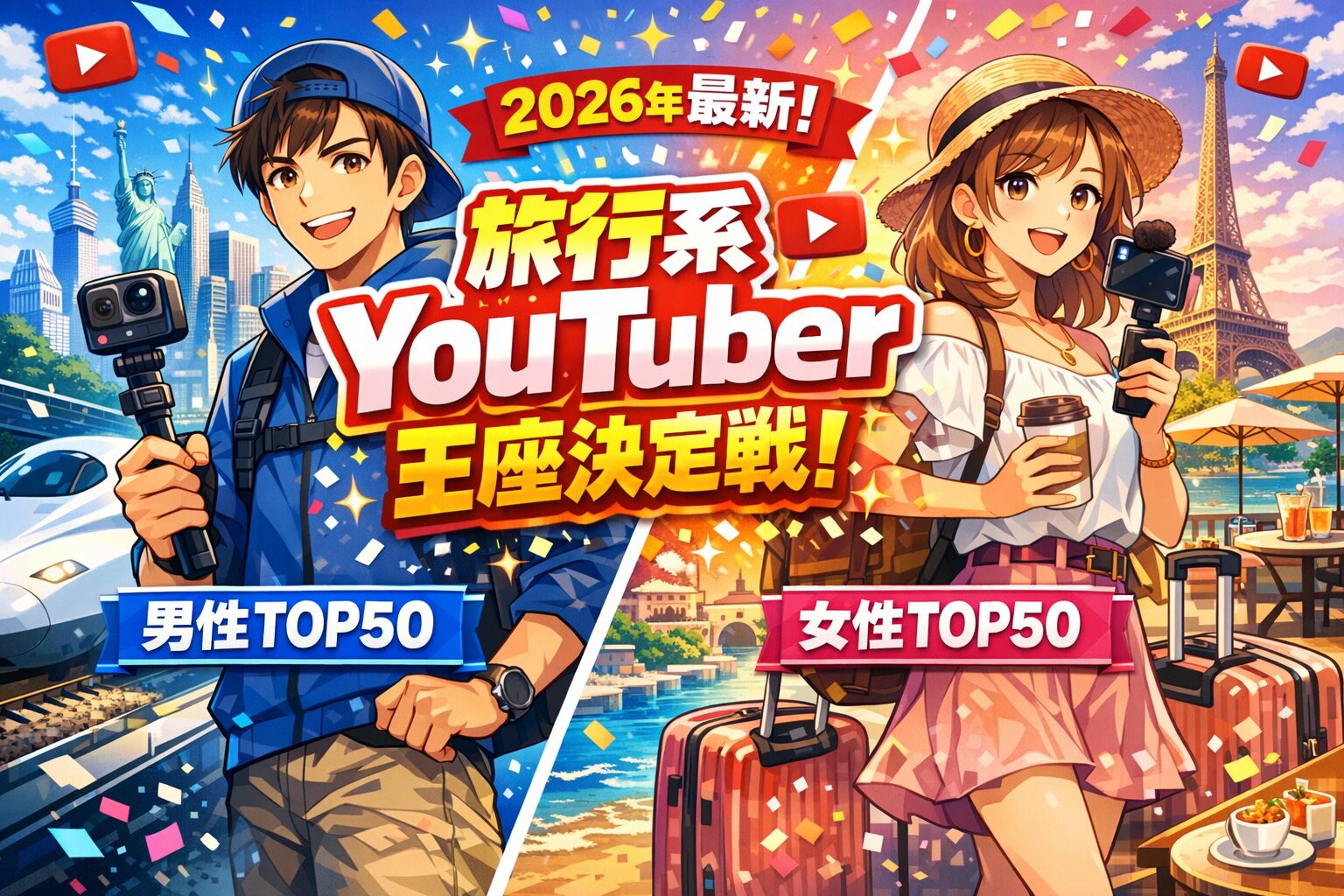 2026年、YouTubeの旅行コンテンツは「ただ観る」ものから「体験を共有する」ものへと進化しました。今回は、最新の登録者数とアクティブな人気度に基づいた**「旅行系YouTuber男女別TOP50」**を完全公開。全チャンネルへの直リンク付きですので、気になるクリエイターをすぐにチェックできます!